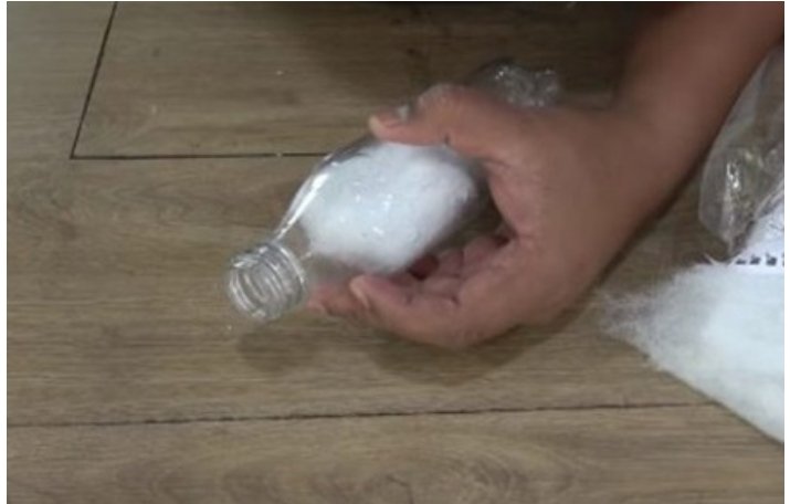 นำขวดพลาสติกมาเจาะรูที่ก้นขวด แล้วใส่ใยแก้วเข้าไปในขวดโดยให้ใส่ลงไป 1/4 ของขวด โดยใยแก้วจะเป็นการกรองน้ำอ ย่ า งละเอียดในชั้นแรก