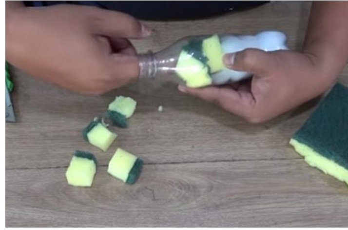 นำฟองน้ำมาตัดเป็นสี่เหลี่ยมลูกเต๋าประมาณ 1 เซนติเมตร แล้วเอาใส่ลงในขวดเป็นชั้นที่สอง โดยใส่ฟองน้ำเข้าไปจนเต็มขวด ซึ่งจะเป็นชั้นกรองส่วนที่กรองห ย า บ ชั้นที่สอง