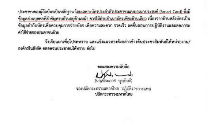รวมถึงมีข้อมูลหลักฐานครบถ้วนอยู่แล้ว อีกทั้งปัจจุบันได้มีการนำบัตรประจำตัวประช าชนแบบอเนกประสงค์ ( Smart Card ) เข้ามาใช้ในระบบอย่ างทั่วถึงแล้ว จึงไม่มีความจำเป็นที่จะต้องถ่ายถึงสองหน้าแบบเดิมอีก