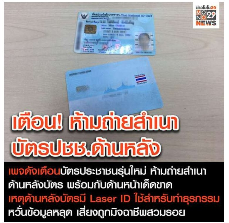 เราเห็นข่าวเมื่อไม่นาน มานี้ ‘ลุงทนายใจดี ปรึกษากฎหมายฟรี’ โ พ ส ต์ เ ตื อ นว่า สำเนาบัตรประช าชนรุ่นปัจจุบัน ไม่ควรถ่ายด้านหลังบัตรของเราไปพร้อมกับด้านหน้าเด็ดข า ด เพราะด้านหลังบัตรจะมีชุดตัวเลข เรียกว่า Laser ID ซึ่งปัจจุบันภาครัฐ เช่น สรรพากร, ตำรวจ, กระทรวงฯ, กรมฯ ต่างๆ ร