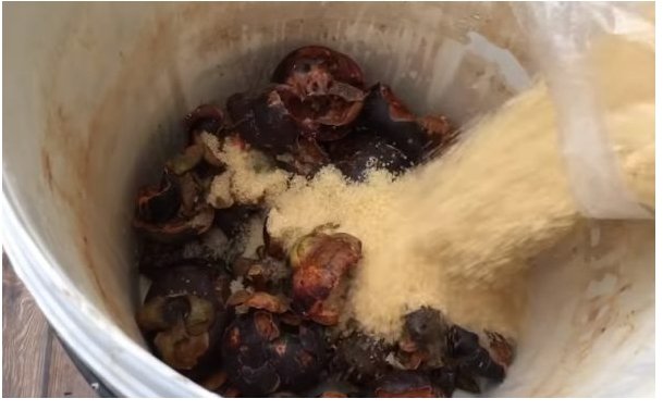 1 นำเปลือมังคุดไปต ากแห้ง 1-2 แดด จากนั้นเก็บมาใส่ในถังห มั ก ให้หมด เทน้ำต าลทรายแดงที่เตรียมเอาไว้ลงไป